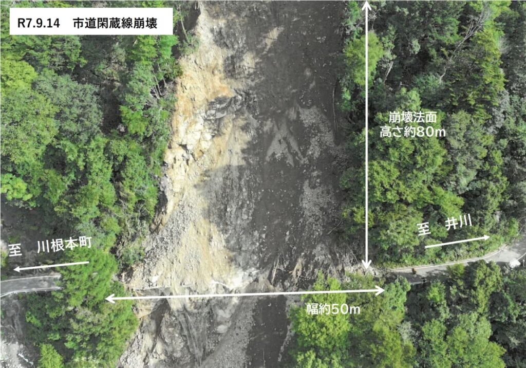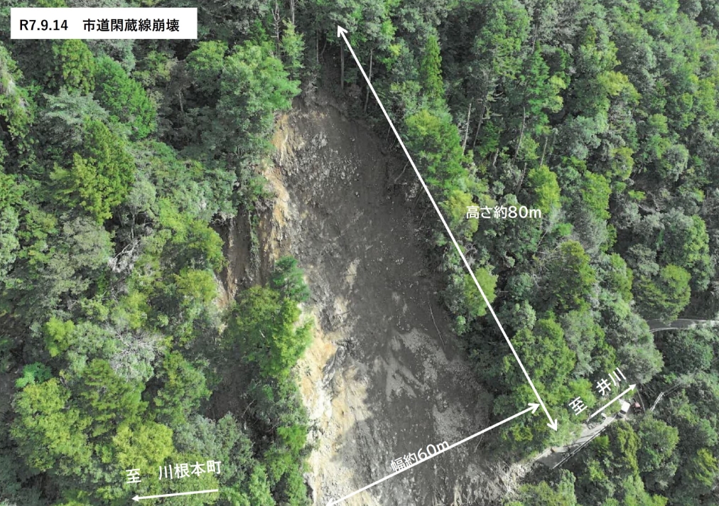 2025年9月14日(日)朝、奥泉ダム貯水池付近で土砂崩落(高さ約80m・幅約60m)が発生。