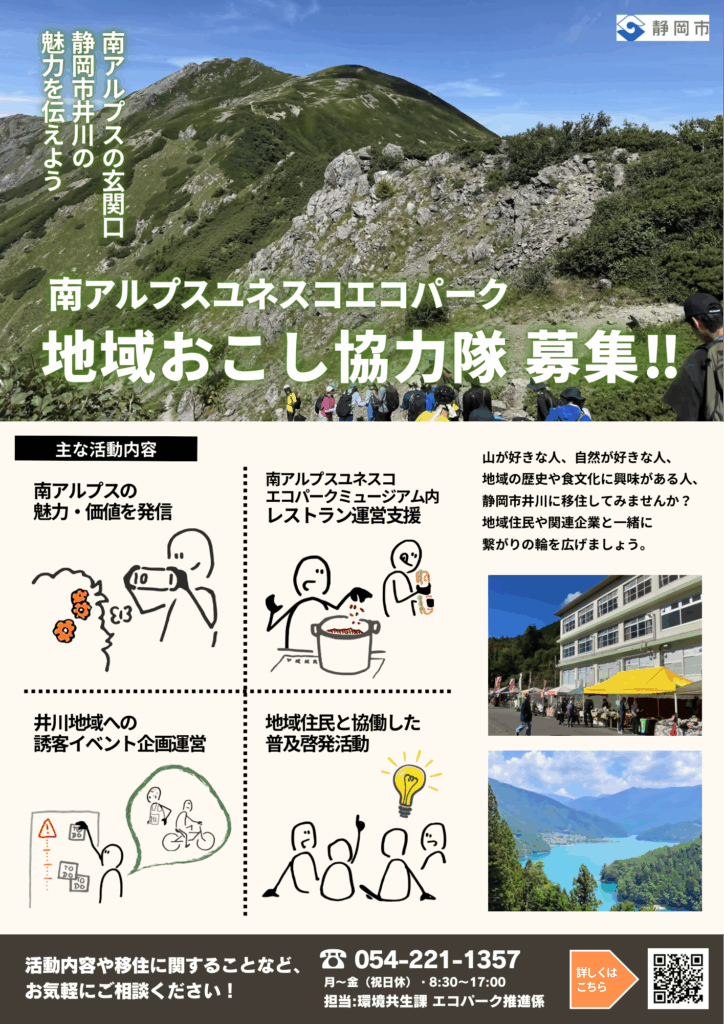 「静岡市南アルプスユネスコエコパーク地域おこし協力隊員設置要綱」に基づき、南アルプスユネスコエコパークの魅力発信及び誘客促進、地域振興に資する事業の支援等の活動を行っていただきます。活動内容や移住に関して不安な点などございましたら、お気軽にご相談ください。- 南アルプスユネスコエコパークの魅力や価値の発信